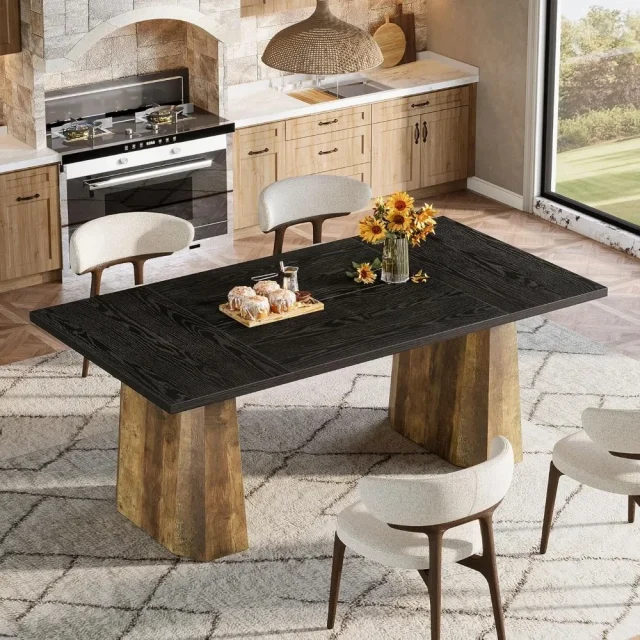 Bring warmth and character to your dining space with this Farmhouse Rectangular Dining Table. Designed to blend rustic charm with modern sophistication, this elegant table features a rich black wood-grain top contrasted beautifully by a warm brown base. Its unique octagonal pedestal base adds visual appeal and exceptional stability, making it not just a piece of furniture—but the heart of your home gatherings.