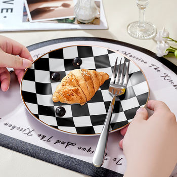 Black and White Plaid Ceramic Dessert Plate with Golden Edge