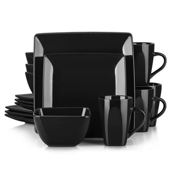 16-Piece Black Square Porcelain Dinnerware Set with Plates, Bowls & Mugs