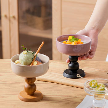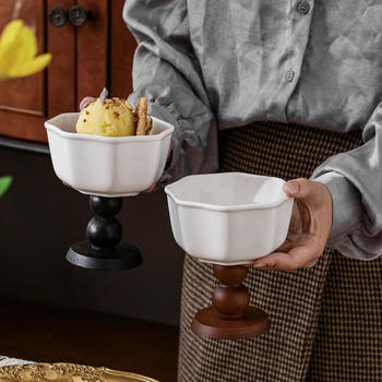 French Vintage Wooden Footed Dessert Bowl – Ceramic Ice Cream & Pudding Dish