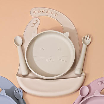 4-Piece Silicone Baby Feeding Set with Bib, Spoon, Fork & Suction Tray
