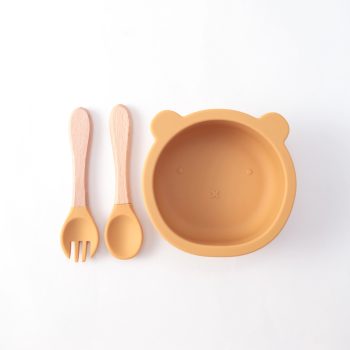 3PCS Baby Silicone Feeding Set with Wooden Handle Spoon and Fork