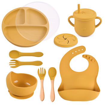 9pcs Silicone Baby Feeding Set with Suction Plate, Bowl, Bib & Utensils