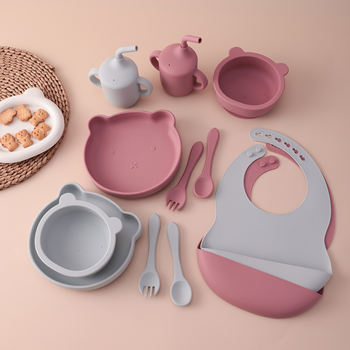 8pcs Baby Feeding Set with Cartoon Silicone Plate, Sucker Bowl, Spoon & Fork + Adjustable Bibs
