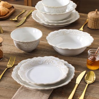 Elegant Relief White Stoneware Dinnerware Set – 16 Pieces for Modern Dining