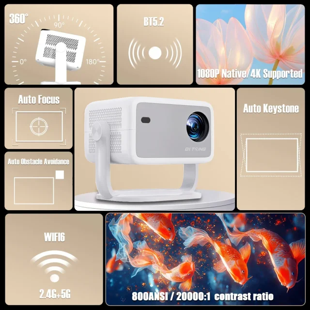 The advanced auto keystone correction and auto focus remove the headache of manual adjustment. Just place it down, turn it on, and enjoy a perfectly aligned screen in seconds. Its unique 360° rotating head lets you project on walls, ceilings, or outdoor screens with complete flexibility.