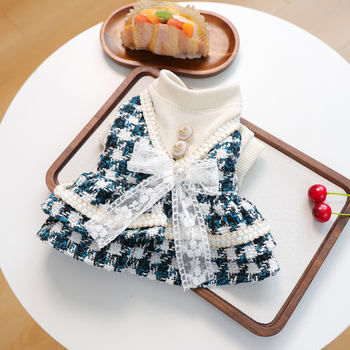 Elegant Blue Dog Dress with White Lace & Pearl Bow – Princess Style