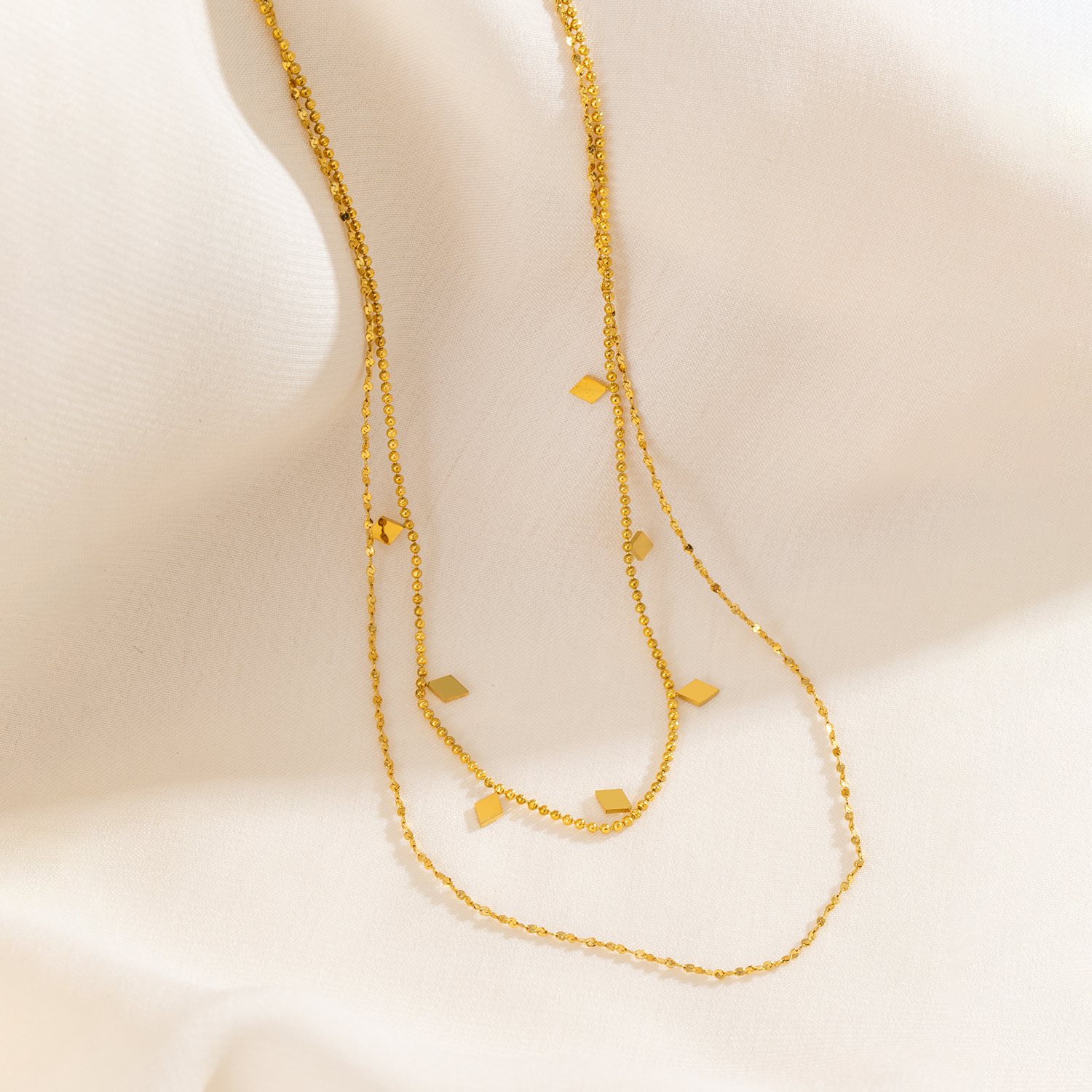 This necklace is made for modern women who want jewelry that looks delicate yet feels strong. The lightweight construction ensures all-day comfort, while the smooth bead-style chains rest gently on your skin. The square-shaped pendant adds a cute and romantic touch, making the design feel current and eye-catching without being overpowering.
