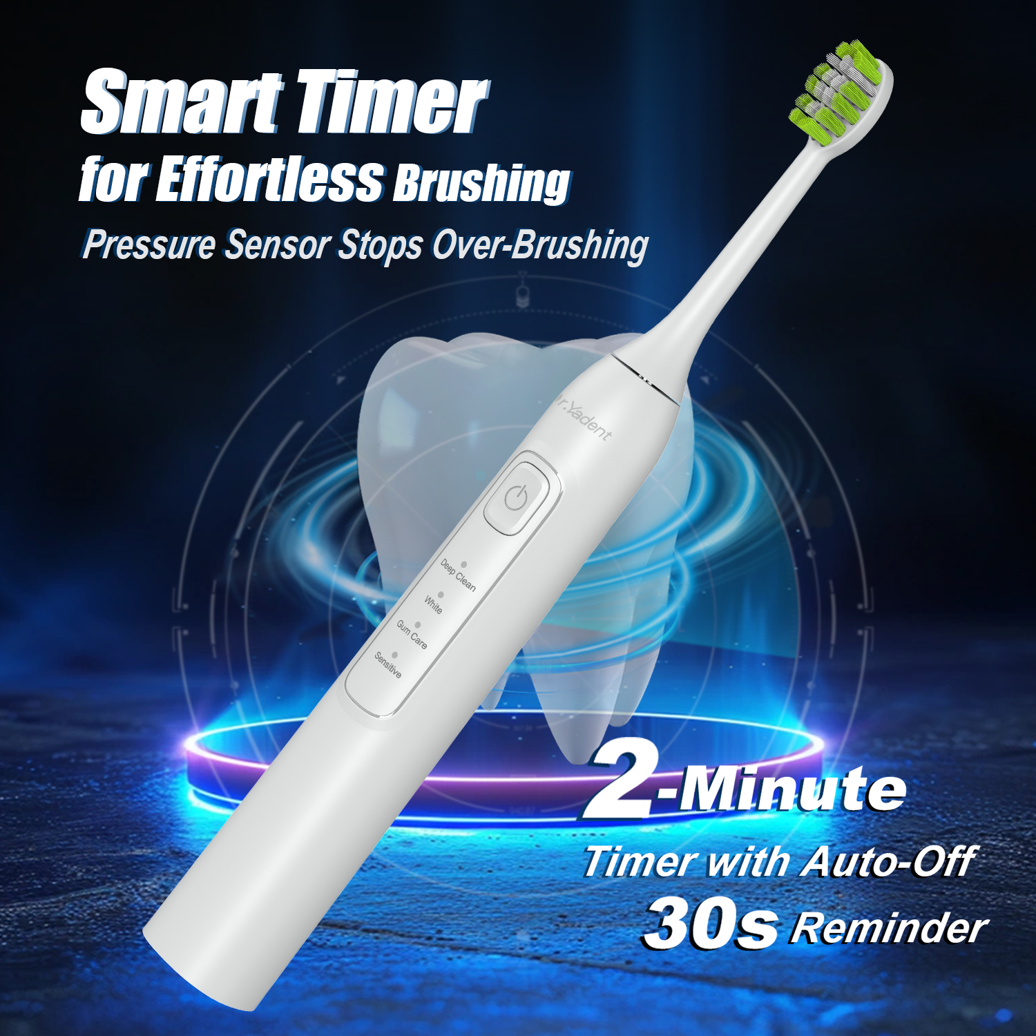 This toothbrush is built with smart technology to enhance your brushing routine. It offers four unique cleaning modes—Deep Clean, Whitening, Sensitive, and Gum Care—making it perfect for morning refresh, nightly deep cleaning, or gentle care whenever your gums feel tender. A built-in 2-minute smart timer with 30-second reminders helps you brush each section of your mouth evenly for a complete, balanced clean every time.