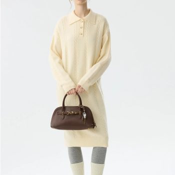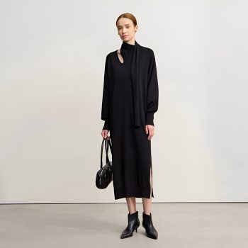 Elegant Winter Wool V-Neck Long Dress with Hollowed-Out Design