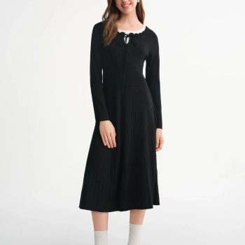 Winter Knitted Long Sleeve A-Line Dress with Textured Flower Design