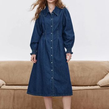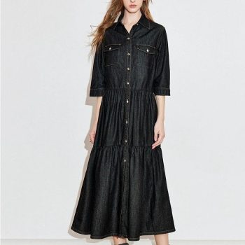 Women’s Black Denim Patchwork A-Line Midi Dress with Three Quarter Sleeves