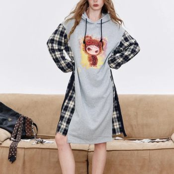 Hooded Plaid Patch Sweater Dress with Cartoon Print – Mid-Calf Winter Style