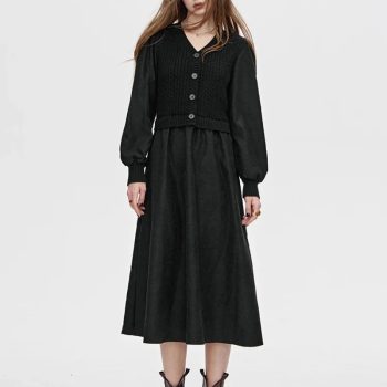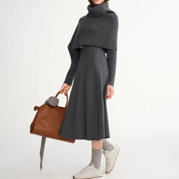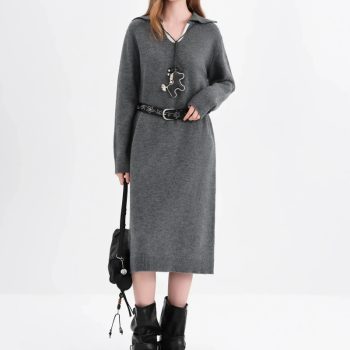 Elegant Knitted Turn-Up Collar Midi Dress with Detachable Pendant