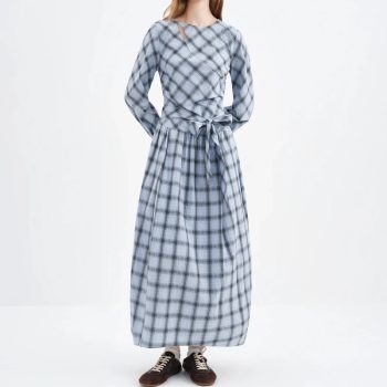 Retro Blue-Grey Plaid Waist-Tie Long Sleeve A-Line Dress
