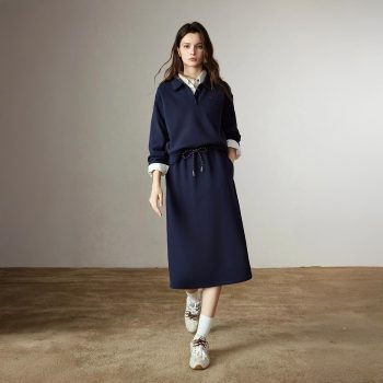 Retro Navy Blue Hoodie & Midi Skirt Fleece Two-Piece Winter Set
