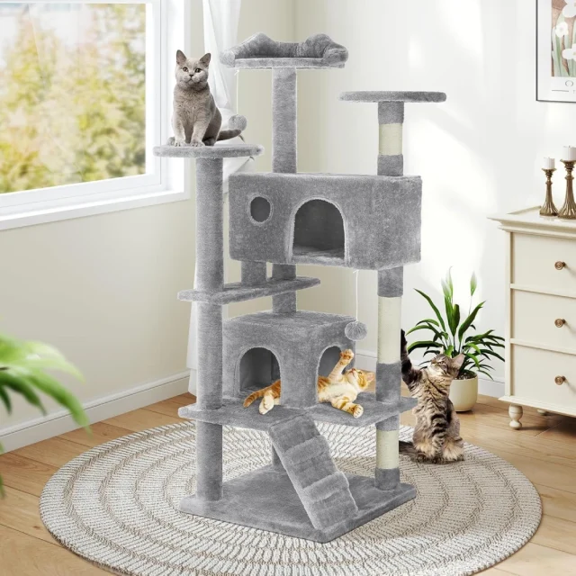 This cat tree strikes the ideal balance between play and relaxation. With three climbable platforms, your cats can explore to their hearts’ content. When they tire from all the fun, the two cozy condos provide the perfect spots for a peaceful nap or a private hideaway, making it a versatile addition to any cat-loving home.
