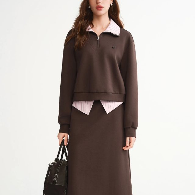 This outfit stands out because it combines sporty street style with a clean, feminine silhouette. The A-line skirt flatters your natural shape, while the turn-down collar and hood add a modern layered look. The contrast splicing and subtle stripes bring just the right amount of detail without looking too busy.