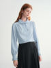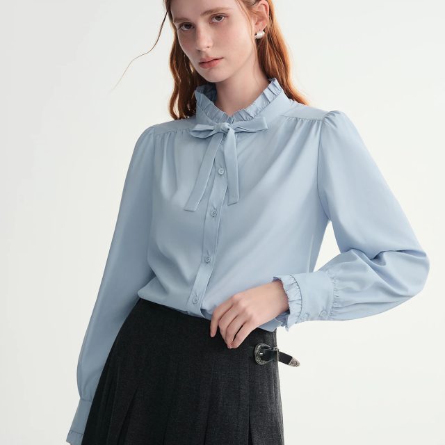 • Design: Features a ruffled collar, puff sleeves, and a chic lace-up tie front, perfect for a polished yet feminine look.