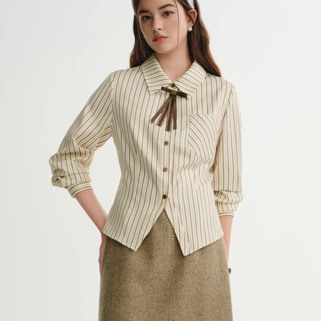 Step into winter with confidence and style with this gorgeous caramel striped shirt. The slim fit design enhances your silhouette while offering enough flexibility to ensure comfort throughout the day. Its high-quality polyester and spandex blend provides the perfect balance of softness, stretch, and durability. You can wear this shirt from the office to the weekend without missing a beat. The bow detail and striped pattern add an extra touch of charm, making it a standout piece in your wardrobe.