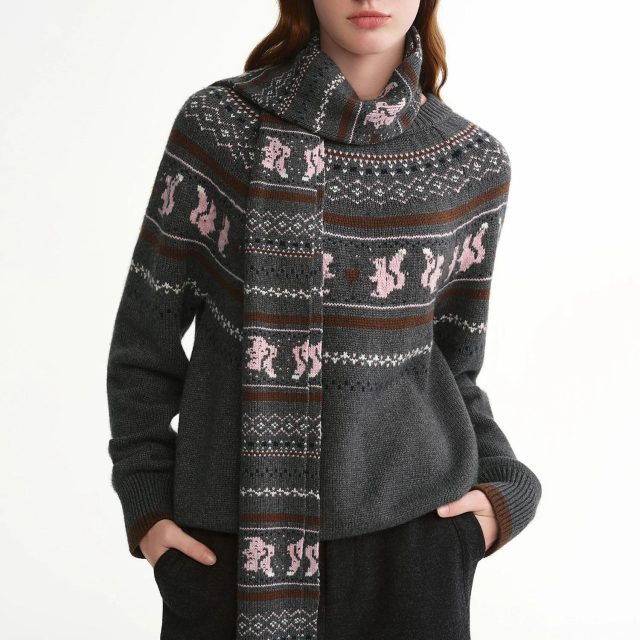 Designed with a classic O-neck and full-length sleeves, this sweater offers a timeless silhouette that flatters every figure. The argyle-inspired knit pattern adds a touch of elegance, while the integrated warm island scarf provides extra coziness and style in one complete look. Its medium fabric weight of 4–7 oz per square yard makes it substantial enough to keep you warm yet light enough to move freely throughout the day.