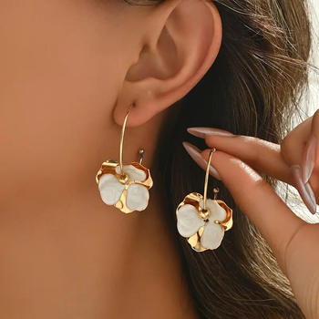 Vintage White Enamel Flower Drop Earrings Gold Plated for Women