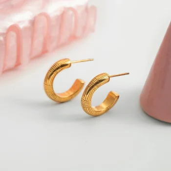 18K Gold-Plated Ribbed C-Shape Stud Earrings for Women – Hypoallergenic Stainless Steel