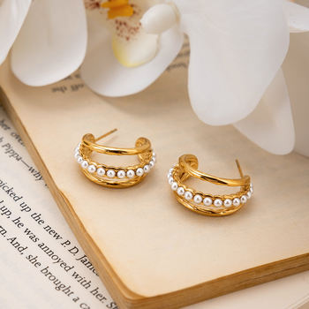 Classic Triple-Layer Pearl C-Shape Earrings 18K Gold Plated Hypoallergenic