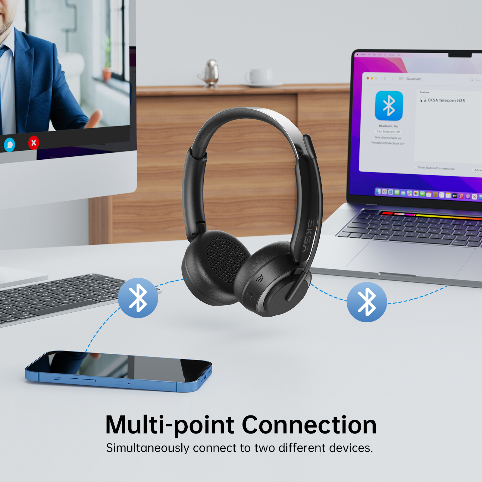 This headset combines advanced Bluetooth 5.4 technology with an intelligent AI noise-cancelling microphone to ensure stable, low-latency performance and crystal-clear conversations. It blocks up to 99.6% of background noise, making it ideal for busy workplaces, home offices, and shared environments. With dual-device connectivity, you can effortlessly switch between your laptop and phone—perfect for multitasking throughout the day.