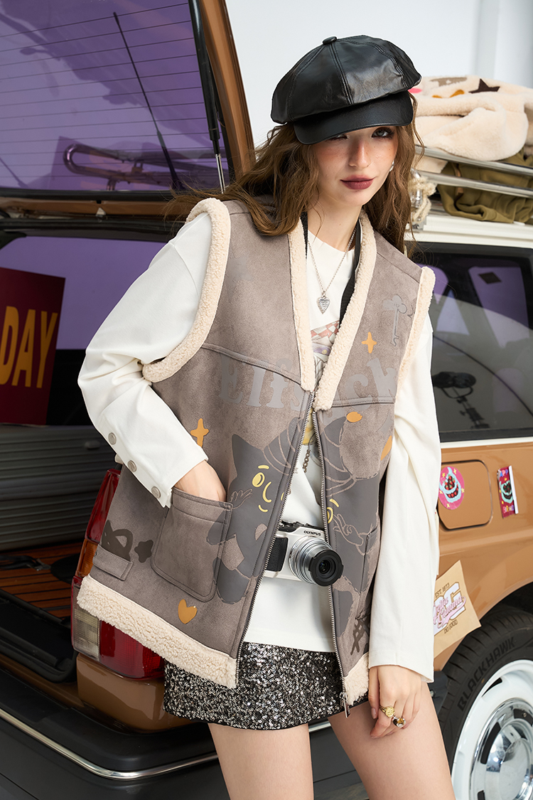 What sets this vest apart is its charming contrast of soft luxury and playful design. The full cartoon and star print gives it a fun, youthful look, while the suede-style fabric and furry texture keep it looking polished and stylish. The V-neck cut flatters the upper body and makes it easy to pair with layered necklaces or scarves. Plus, it has functional pockets and a front zipper for everyday convenience.