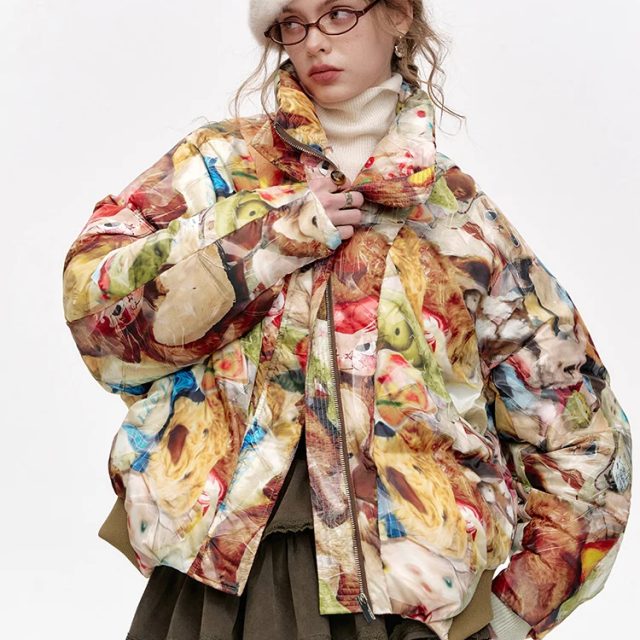 This down jacket is the ultimate combination of fashion and function. It is designed to keep you warm, comfortable, and looking fabulous throughout the winter season. Its light weight and regular length make it easy to layer over any outfit, whether you’re wearing a sweater or a hoodie. The cartoon print makes it stand out from other winter jackets, offering a fresh take on the classic puffer style.