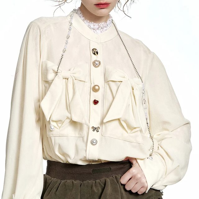 This shirt stands out because it blends classic tailoring with delicate decorative elements. The velvet texture brings warmth and softness, while the bow adds personality without overwhelming your look. It’s the kind of piece you reach for when you need something that feels special but still suits everyday wear.
