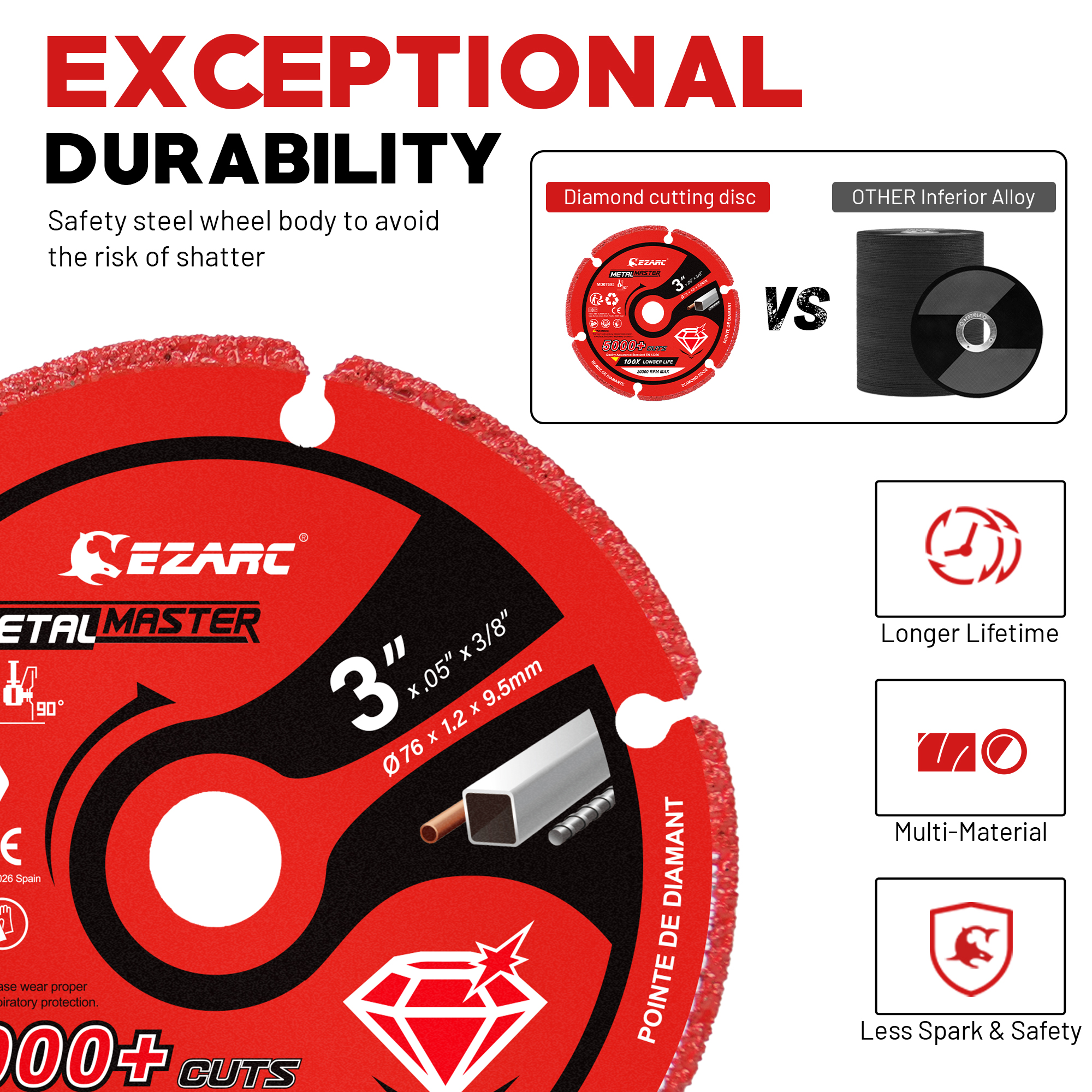 Each wheel features a solid steel core body engineered for safety and stability, minimizing risks of shattering or breaking during use. Unlike abrasive wheels, this diamond wheel produces minimal dust and debris, ensuring a cleaner workspace and a healthier environment. Plus, the consistent wheel size maintains perfect precision from the first to the last cut.