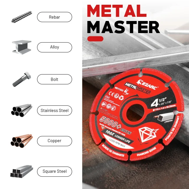 Diamond Cutting Surface: One wheel replaces over a hundred traditional abrasive discs, delivering over 5,000 fast and clean cuts with minimal wear. All-Metal Application: Ideal for rebar, iron, alloy steel, stainless steel, aluminum, sheet metal, and pipes. Solid Steel Core: Reduces breakage risks and creates a cleaner, safer workspace with less dust. High-Speed Performance: Supports up to 13,300 RPM for efficient, smooth cutting. Consistent Accuracy: Maintains its original diameter for better control and straight, precise cuts.