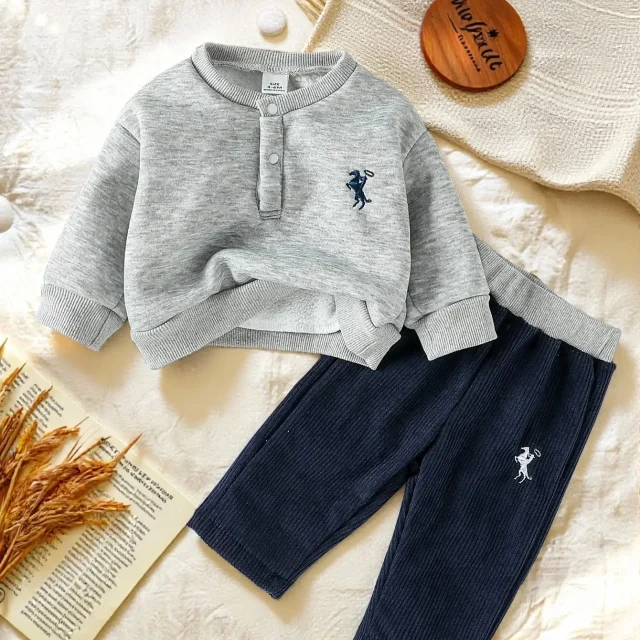 Cozy Winter Plush Baby Boys Hoodie & Sweatpants Set – Embroidered Horse Design
