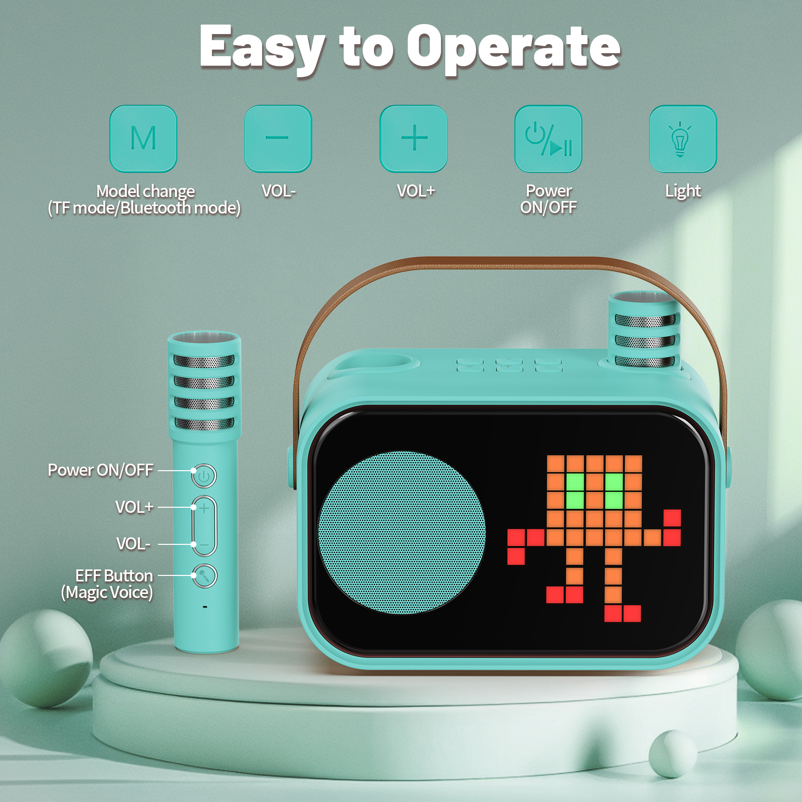 Introducing the ultimate entertainment companion for kids! This Bluetooth Karaoke Speaker is designed to make every moment a blast. Whether your child is singing their favorite songs or hosting a mini concert, this speaker adds fun, laughter, and creativity to their playtime. With built-in animated modes and four hilarious magic voices, your kids will enjoy hours of singing, dancing, and laughing with friends and family.