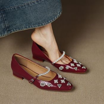 Pearl Mary Jane Pumps – Square Toe Low Heel Leather Shoes