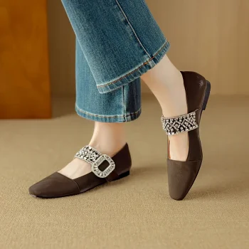 Square Toe Mary Jane Pumps with Low Heel & Rhinestone Buckle
