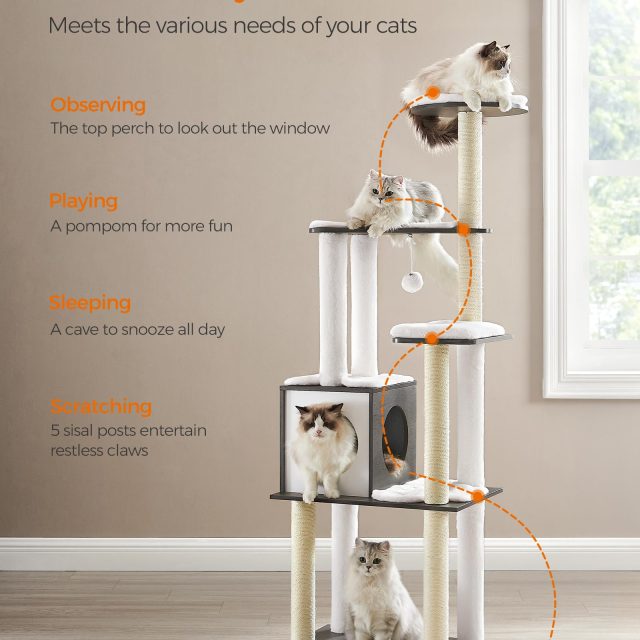 • Multiple Levels: From watching the world from the top perch to snoozing in the cozy cave, this cat tree provides countless exploration and relaxation opportunities.