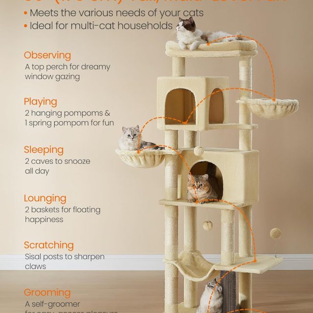 This cat tower is best used in any indoor space where your cats spend time—living rooms, bedrooms, or quiet corners. It’s not just a cat tree; it’s their kingdom. Whether they’re climbing to the top for a panoramic view, curling up for a nap, or energetically scratching away, this all-in-one structure fulfills their every need. The neutral design fits seamlessly into your home decor, while giving your cats a safe and exciting environment they’ll love.