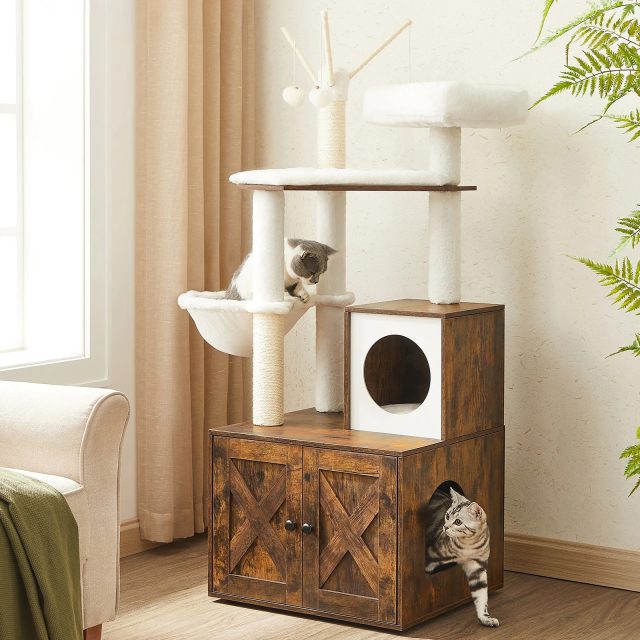 This 2-in-1 cat condo is ideal for cat owners who want to maximize their space without compromising on functionality. The multi-use design offers an innovative solution for both your pet’s playtime and bathroom needs. Whether you’re looking for a safe place for your cat to rest or a stylish addition to your living room, this cat tree has you covered. With its large bottom compartment, you can store all your pet’s essentials neatly behind closed doors, keeping everything organized and out of sight.