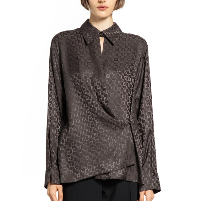 The shirt is crafted from 100% silk, ensuring a soft, smooth feel against your skin. Its rich brown jacquard fabric features the iconic FF motif, adding a touch of Fendi’s signature style to your wardrobe. The shirt’s asymmetrical closure with a small side button enhances its unique draped effect, while the cut-out detail on the neckline brings a subtle hint of allure. With a structured shirt collar and wide buttoned cuffs, this shirt strikes the perfect balance between classic design and contemporary flair.