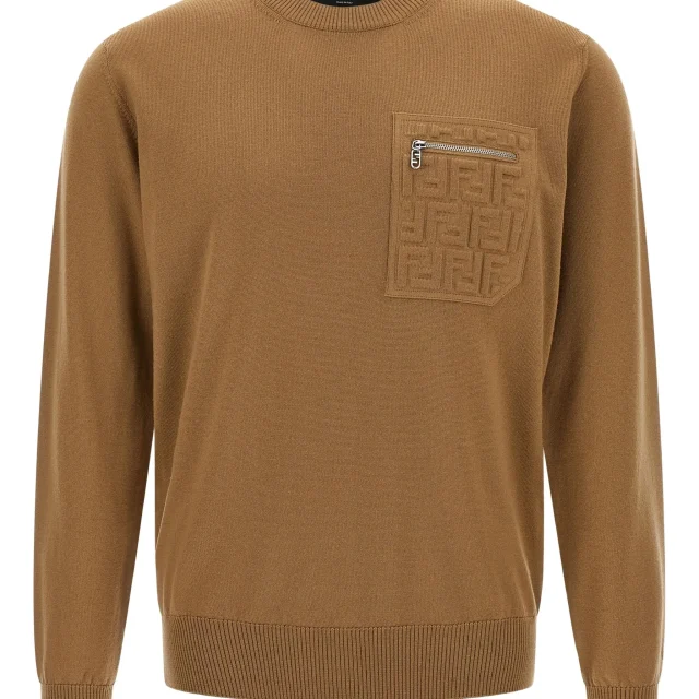 The sweater features a refined beige hue that effortlessly complements any outfit, while the embossed FF logo pocket adds a touch of iconic FENDI flair. The crew neck design ensures a comfortable fit, while the long cuffed sleeves and zip closure add functional style. The lightweight yet cozy wool knit is perfect for layering during colder months, making it a versatile piece for year-round wear.