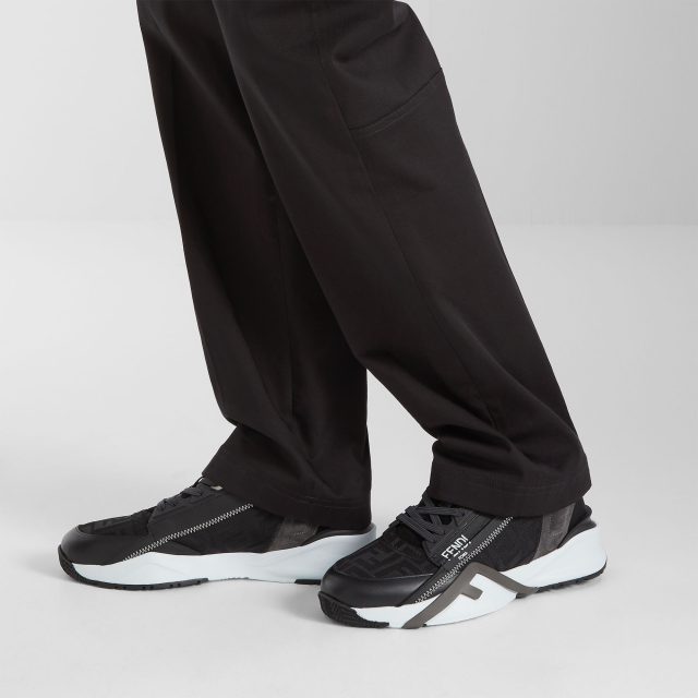 Crafted with attention to detail, these sneakers feature a sleek black FF jacquard nylon fabric, paired with black leather and gray suede accents for a refined look. The slip-on design, enhanced with elastic laces and a convenient side zipper, offers a perfect fit, while the distinctive corrugated sole provides exceptional grip and comfort. The white rubber soles are subtly highlighted with a gray diagonal F detail, adding a modern touch to the classic silhouette.