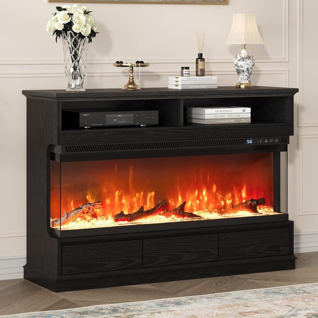Fireplace TV Stand with 50″ Electric Fireplace, 3-Side Glass Display & Storage Drawers
