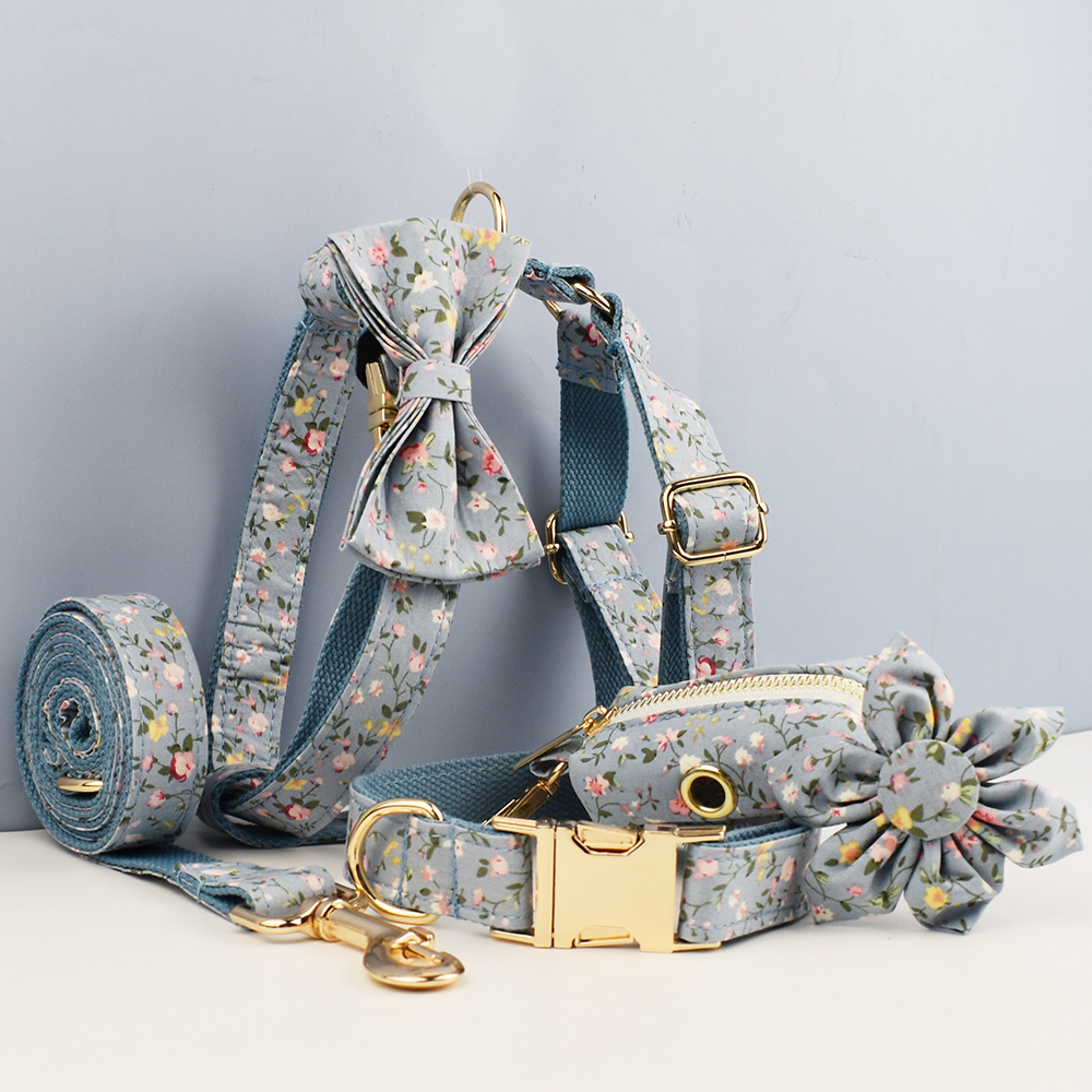Floral Dog Collar and Leash Set with Engraved Nameplate for All Dog Sizes