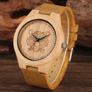 Natural Bamboo Quartz Watch with Engraved Tiger/Elk Dial & Brown Leather Strap