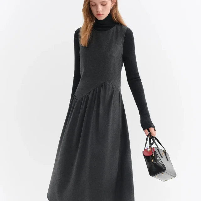 What truly sets this dress apart is its premium fabric composition made with real sheep wool, polyester fiber, and viscose for warmth, durability, and a smooth feel. The slight stretch ensures comfort without losing shape, while the empire waistline enhances your figure subtly and naturally. The sleeveless, O-neck design allows for easy layering with coats, cardigans, or turtlenecks, making it a versatile essential for autumn and winter wardrobes.