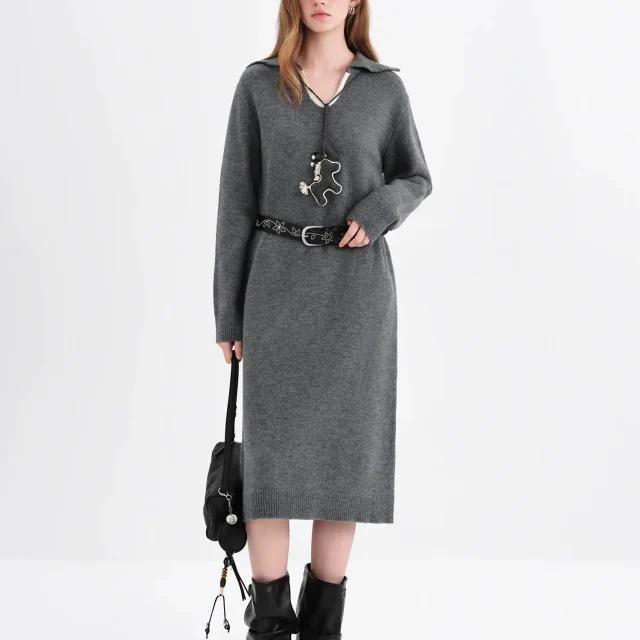 What truly sets this dress apart is its balance of comfort and sophistication. The knitted texture adds warmth and softness, while the three-dimensional pendant detail brings a unique fashion touch you won’t find in basic winter dresses. The turn-up collar enhances its structured look, making it both professional and stylish.