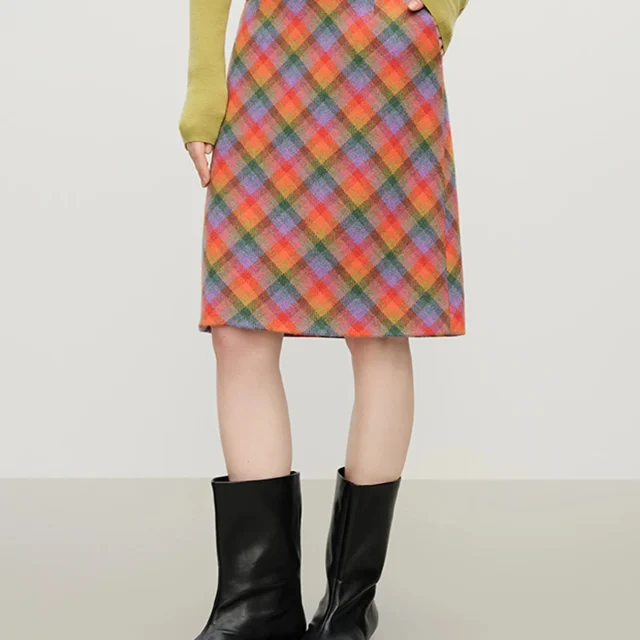 This skirt stands out with its 100% sheep wool fabric, which offers natural warmth without feeling bulky. The empire waistline creates a flattering silhouette, lifting and shaping your look while making it comfortable for all-day wear. Its A-line fit flows naturally around your body, giving you freedom of movement and a soft feminine shape. The retro rainbow plaid pattern adds a playful, age-reducing effect that keeps your outfit looking young, fresh, and stylish.